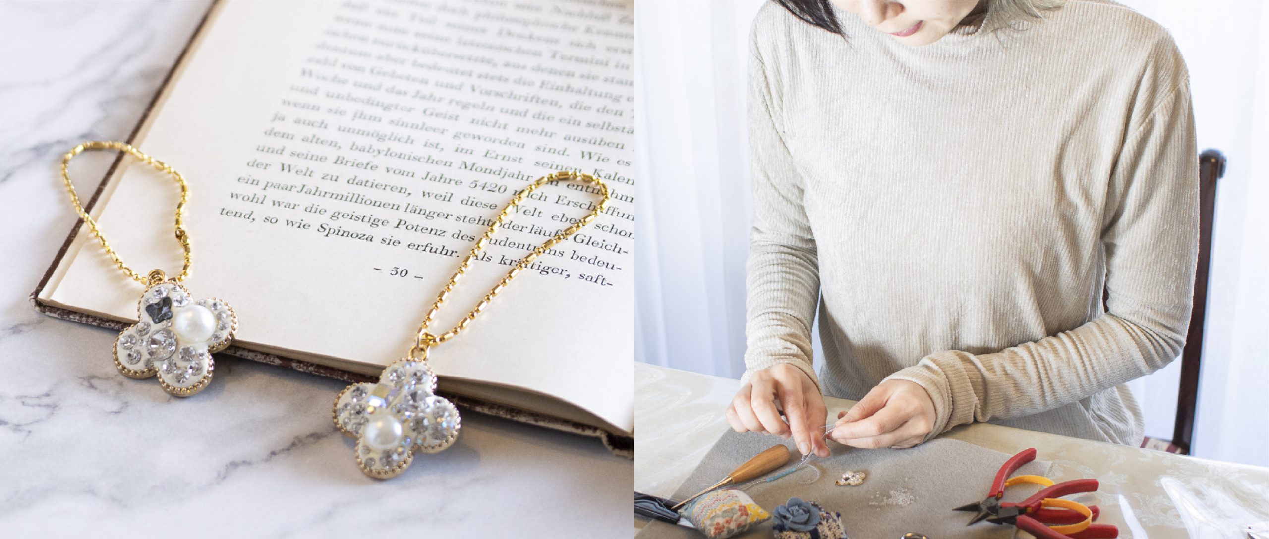 ビーズ専用のワイヤーを使ったり、レース糸を結んだり、接着剤で貼り付けるなど、さまざまなテクニックを取り入れています。