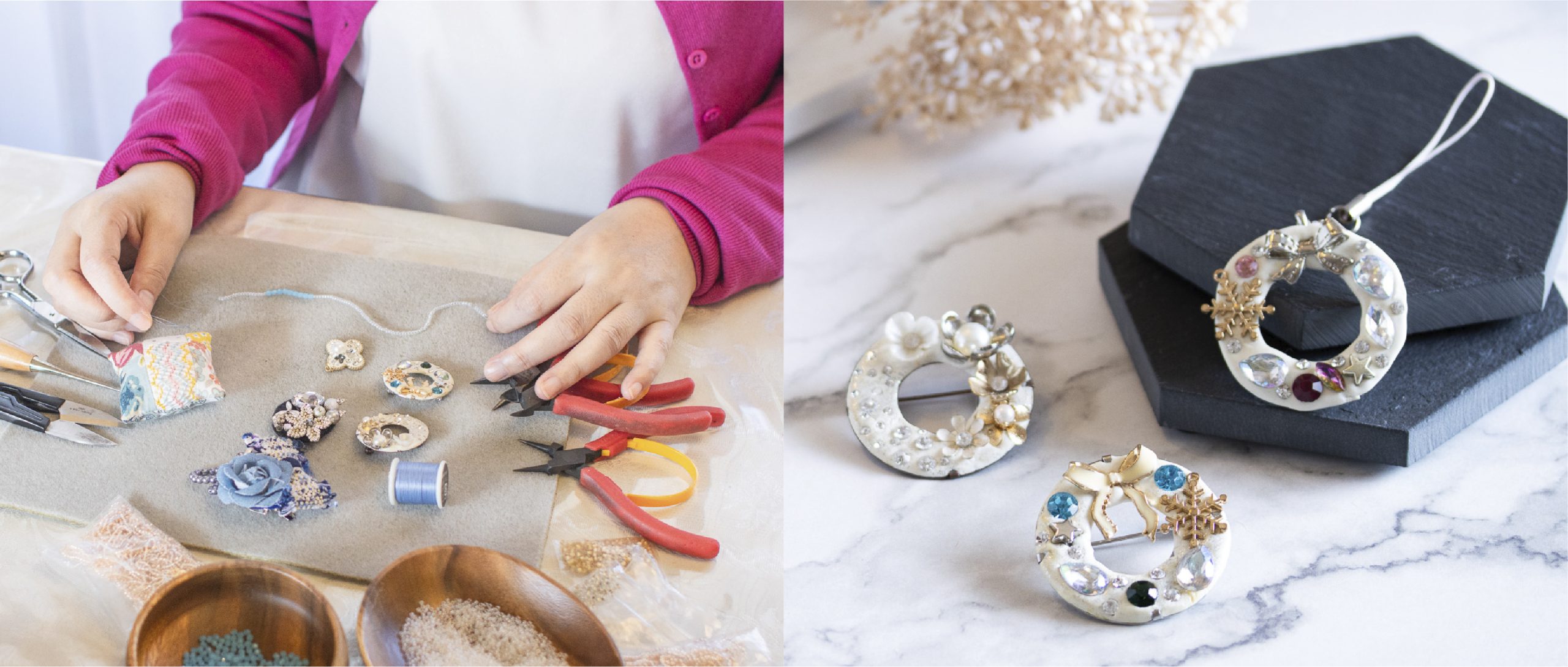 | レッスン内容 | ビーズやワイヤー、かぎ針を使った多彩な手仕事を楽しめる一回完結型クラスで、アクセサリーやインテリア小物の制作を提供しています。 |