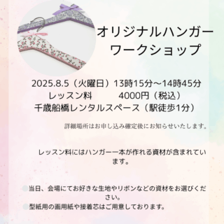 大人の方向けの型紙から取るオリジナルハンガーのワークショップです。開催日時 2025.8.5(火曜日) 13時15分〜14時45分場所 小田急線千歳船橋駅より徒歩1分のレンタルスペース